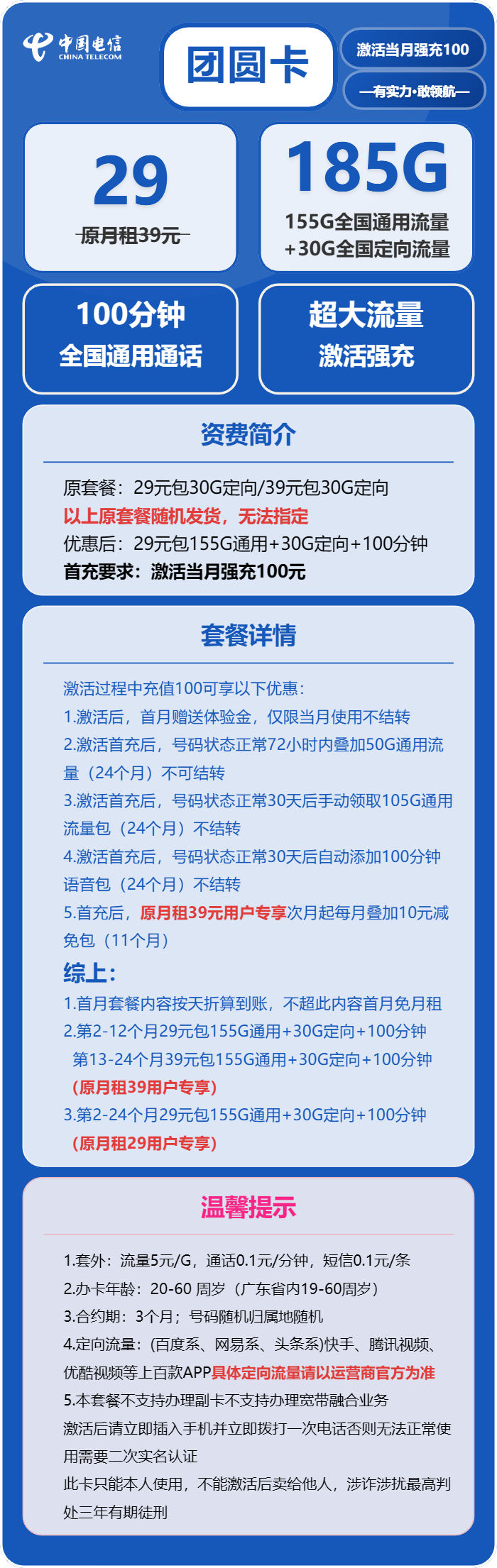 流量卡星球 未分类 电信团圆卡29元包155G通用+30G定向+100分钟免费领取 包邮到家 https://www.06111.cn/%e7%94%b5%e4%bf%a1%e5%9b%a2%e5%9c%86%e5%8d%a129%e5%85%83%e5%8c%85155g%e9%80%9a%e7%94%a830g%e5%ae%9a%e5%90%91100%e5%88%86%e9%92%9f%e5%85%8d%e8%b4%b9%e9%a2%86%e5%8f%96-%e5%8c%85%e9%82%ae%e5%88%b0/