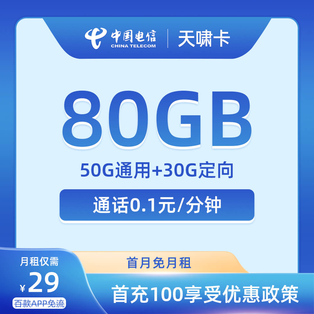免费办理入口:电信天啸卡29元包50G通用+30G定向+通话0.1元/分钟