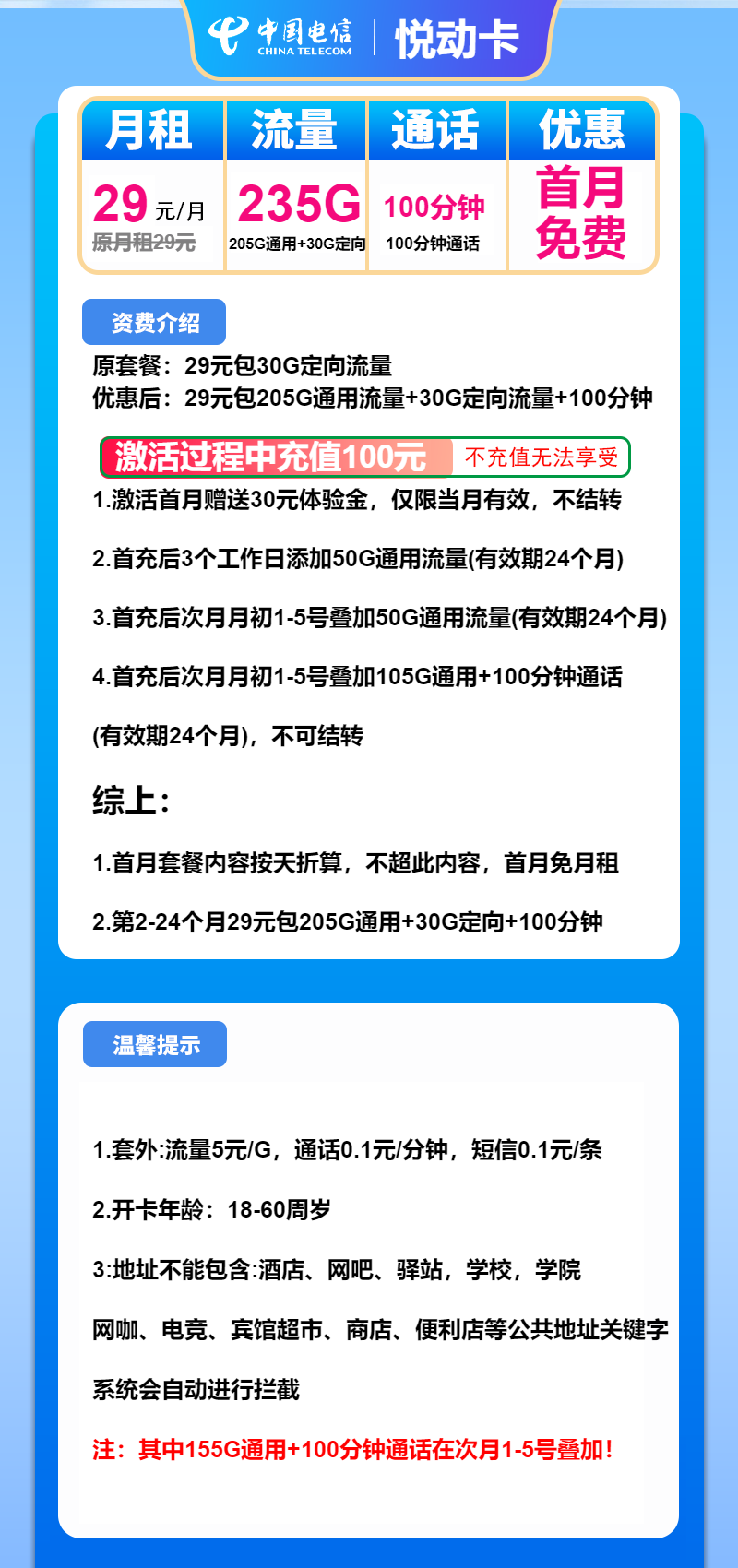 电信悦动卡29元包205G通用+30G定向+100分钟通话