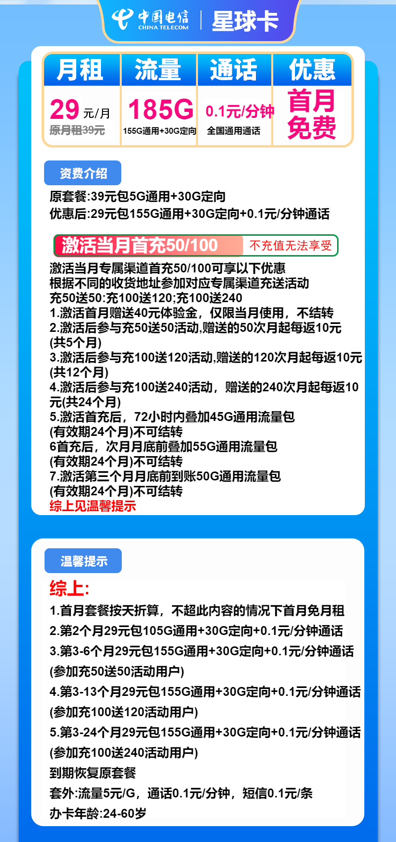 免费办理入口:电信星球卡29元包155G通用+30G定向+通话0.1元/分钟