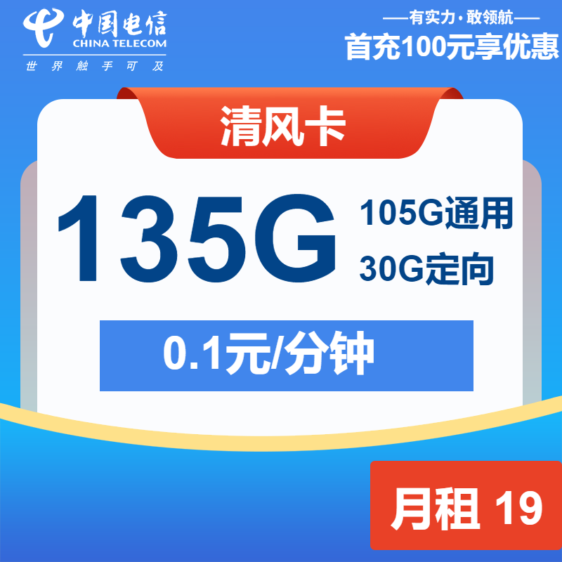 免费办理入口:电信清风卡19元包105G通用+30G定向+通话0.1元/分钟
