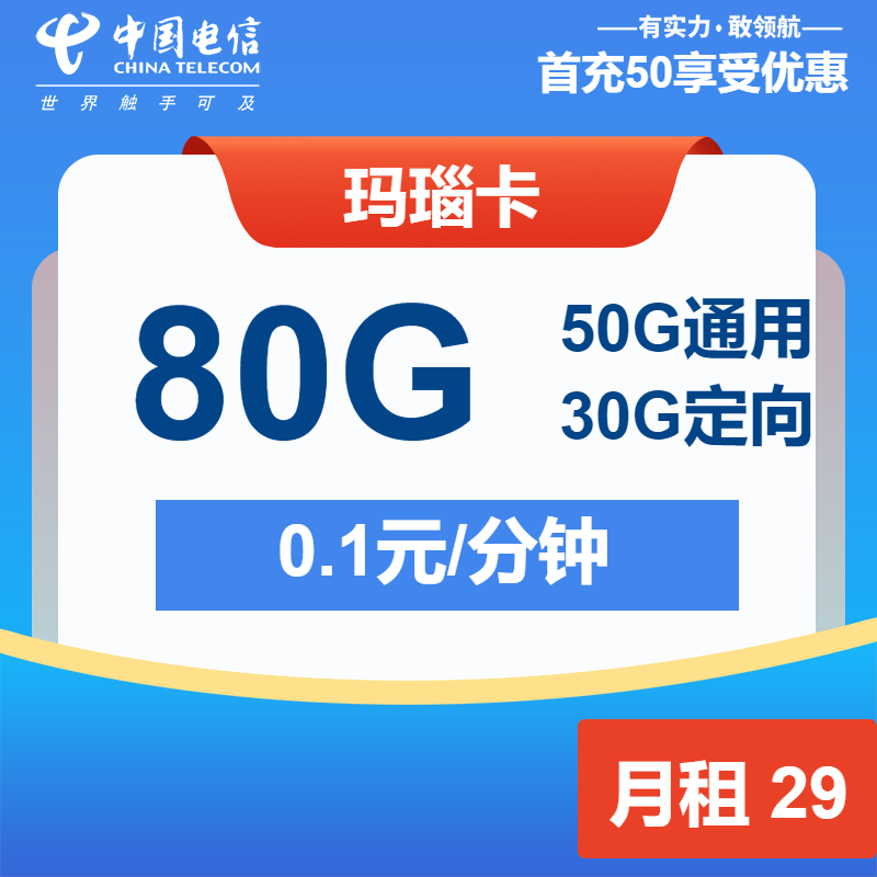 电信玛瑙卡29元包50G通用+30G定向+通话0.1元/分钟