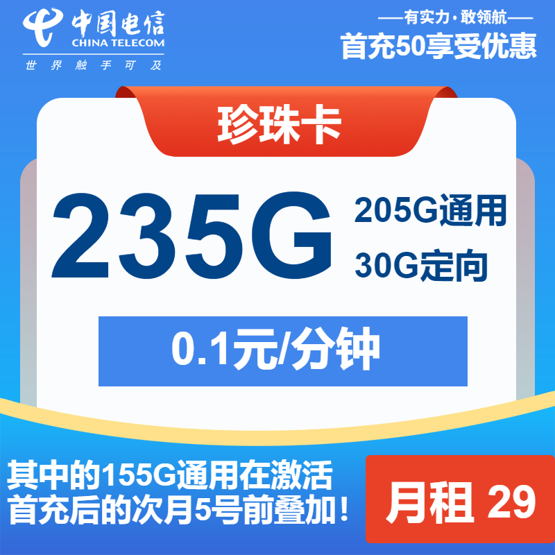 电信珍珠卡29元包205G通用+30G定向+通话0.1元/分钟