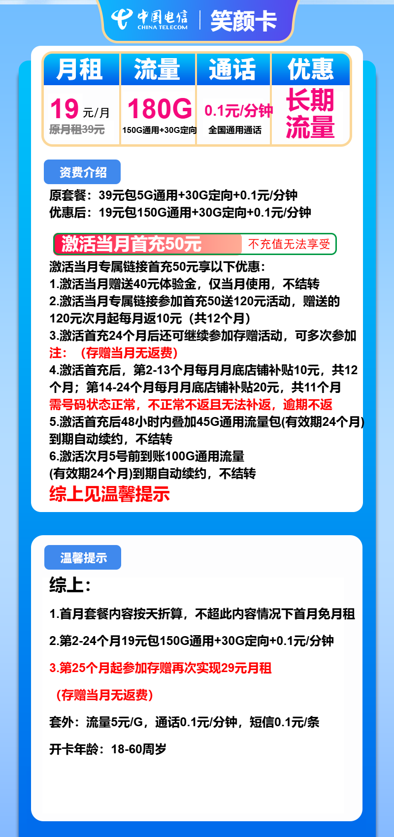 免费办理入口:电信笑颜卡19元包150G通用+30G定向+通话0.1元/分钟