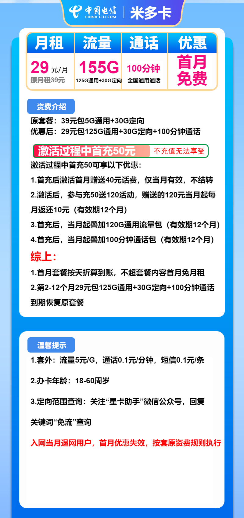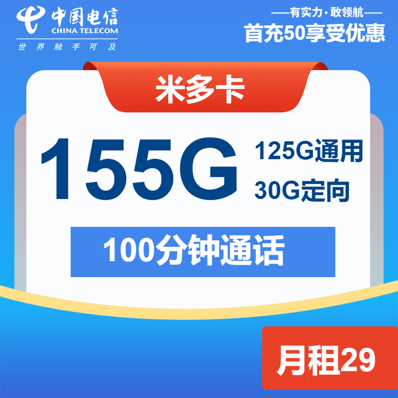 免费办理入口:电信米多卡29元包125G通用+30G定向+100分钟通话