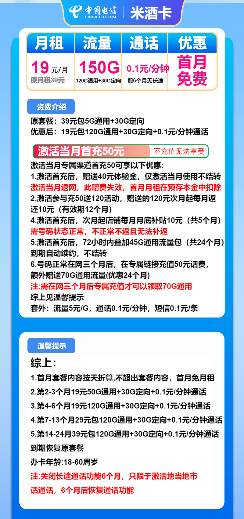 免费办理入口:电信米酒卡19元包120G通用+30G定向+通话0.1元/分钟