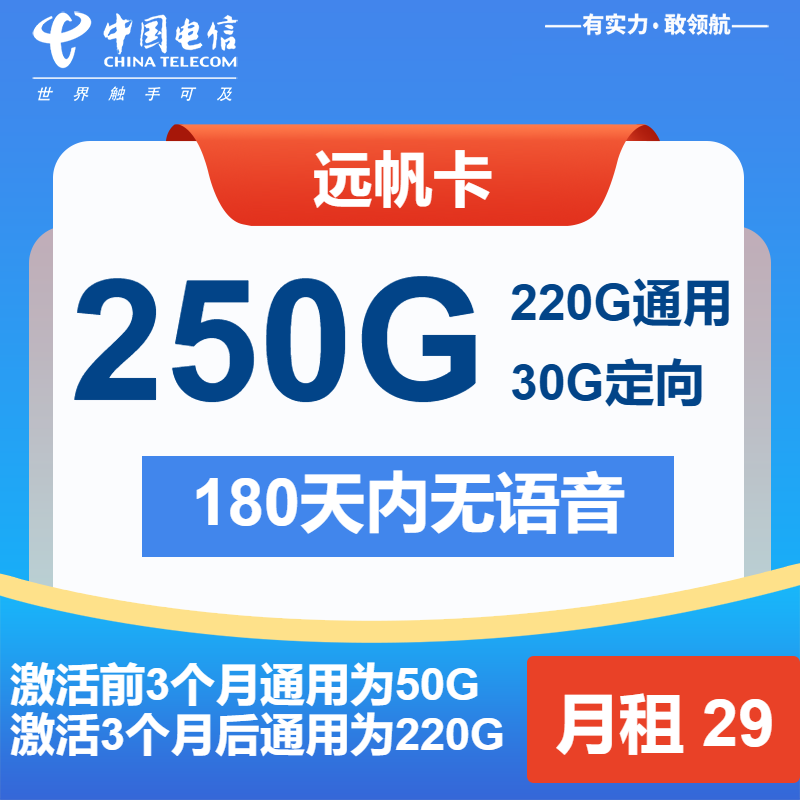 免费办理入口:电信远帆卡29元包220G通用+30G定向+无语音