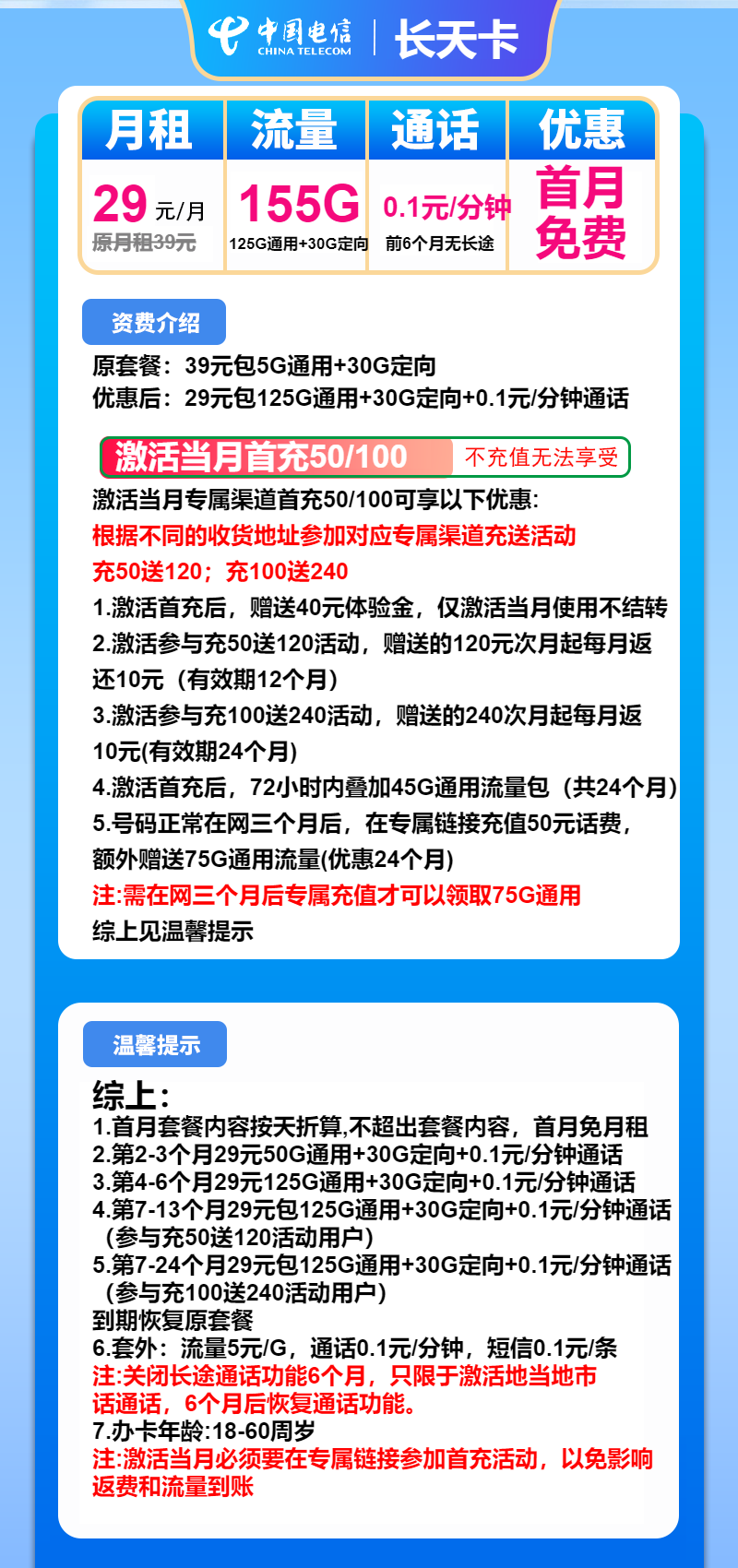 免费办理入口:电信长天卡29元包125G通用+30G定向+通话0.1元/分钟
