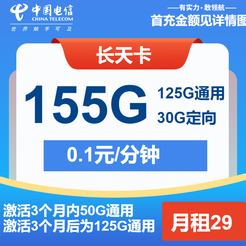电信长天卡29元包125G通用+30G定向+通话0.1元/分钟