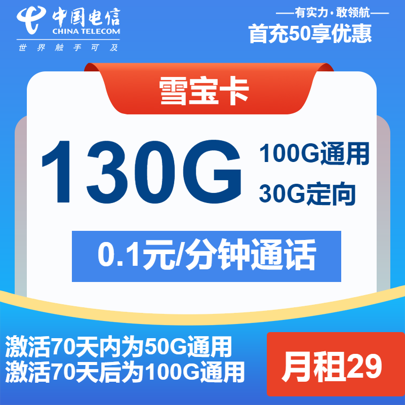 电信雪宝卡29元包100G通用+30G定向+通话0.1元/分钟