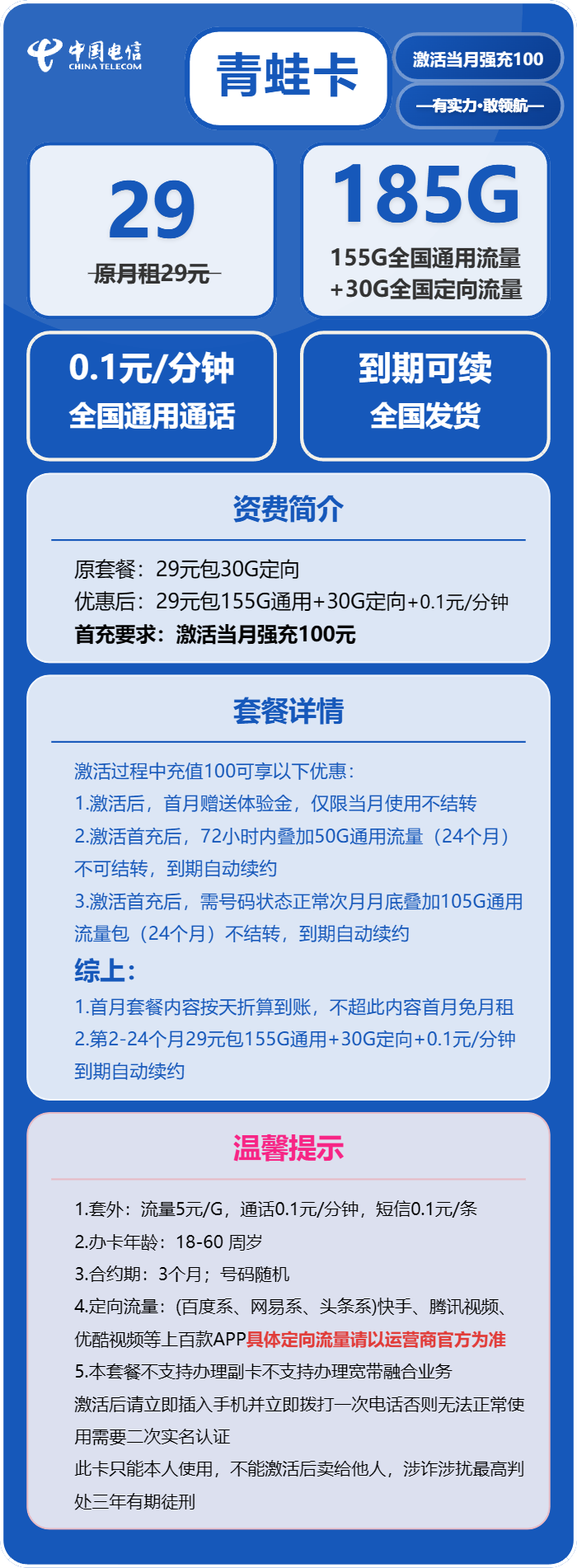 电信青蛙卡29元包155G通用+30G定向+通话0.1元/分钟免费领取 包邮到家