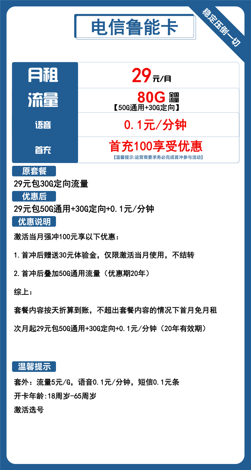 电信鲁能卡29元包50G通用+30G定向+通话0.1元/分钟