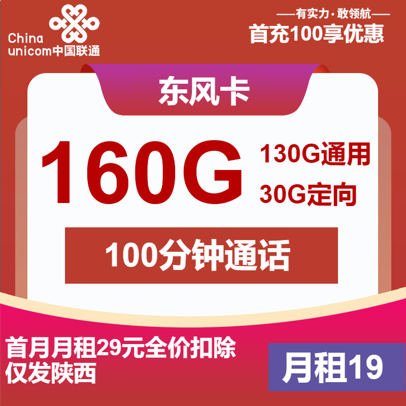 联通东风卡19元包130G通用+30G定向+100分钟通话