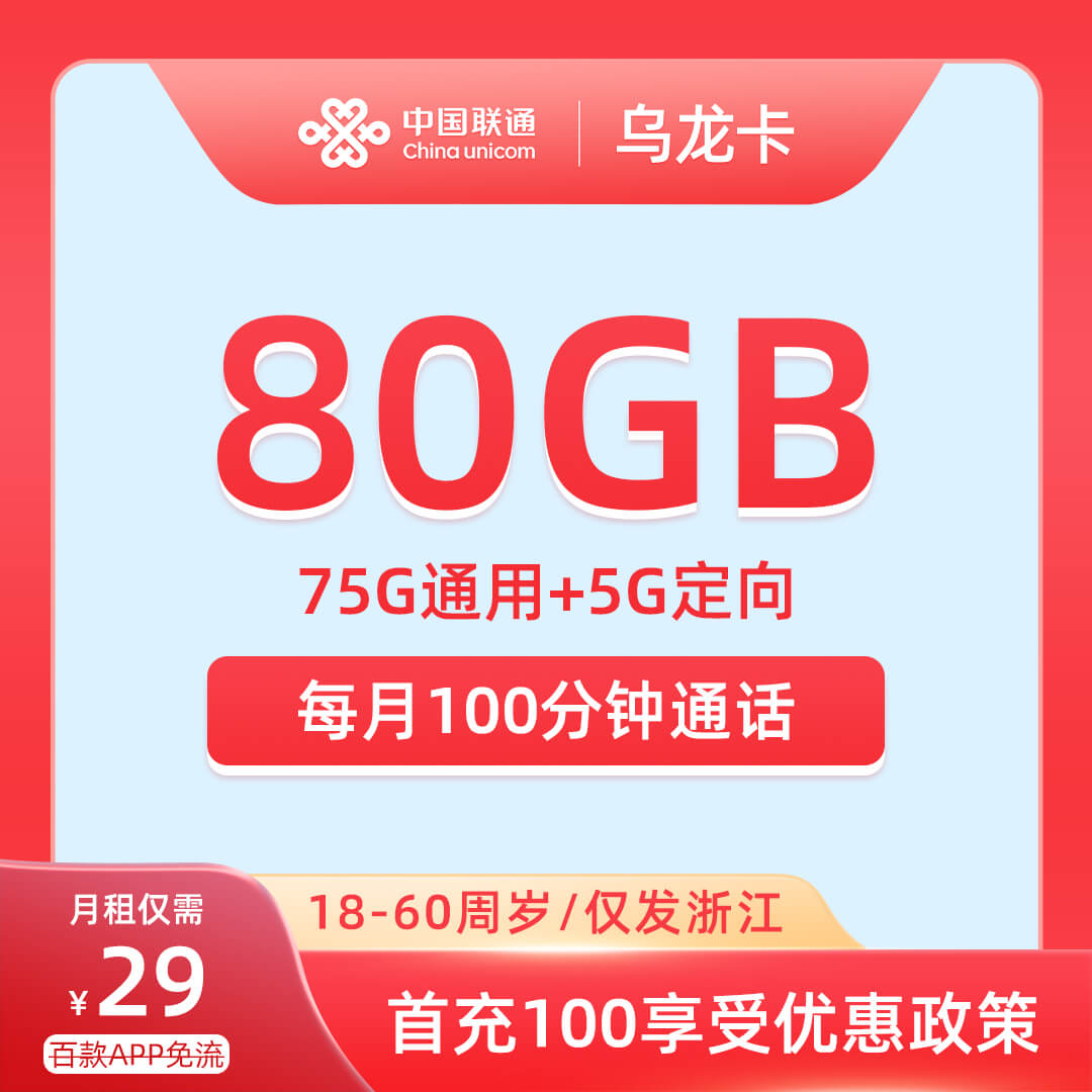 联通乌龙卡29元75G通用+5G定向+100分钟通话