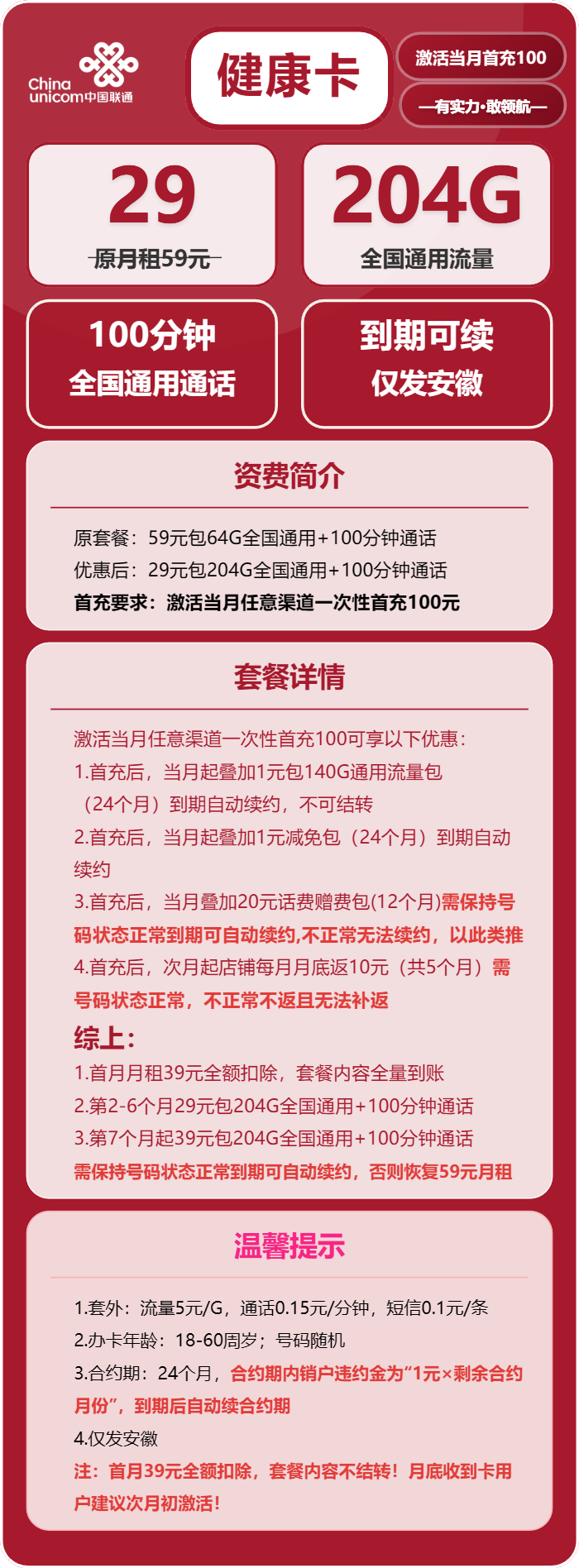 联通健康卡29元包204G通用+100分钟免费领取 包邮到家