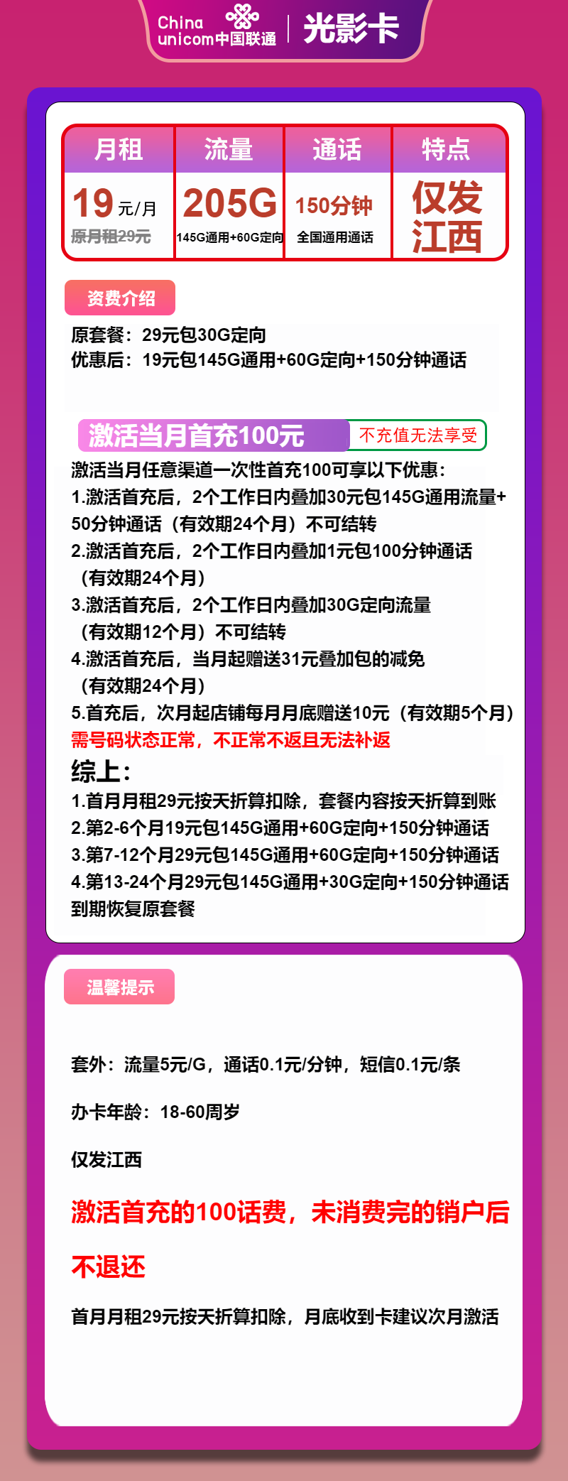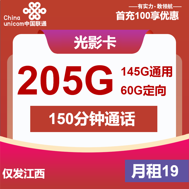 免费办理入口:联通光影卡19元包145G通用+60G定向+150分钟