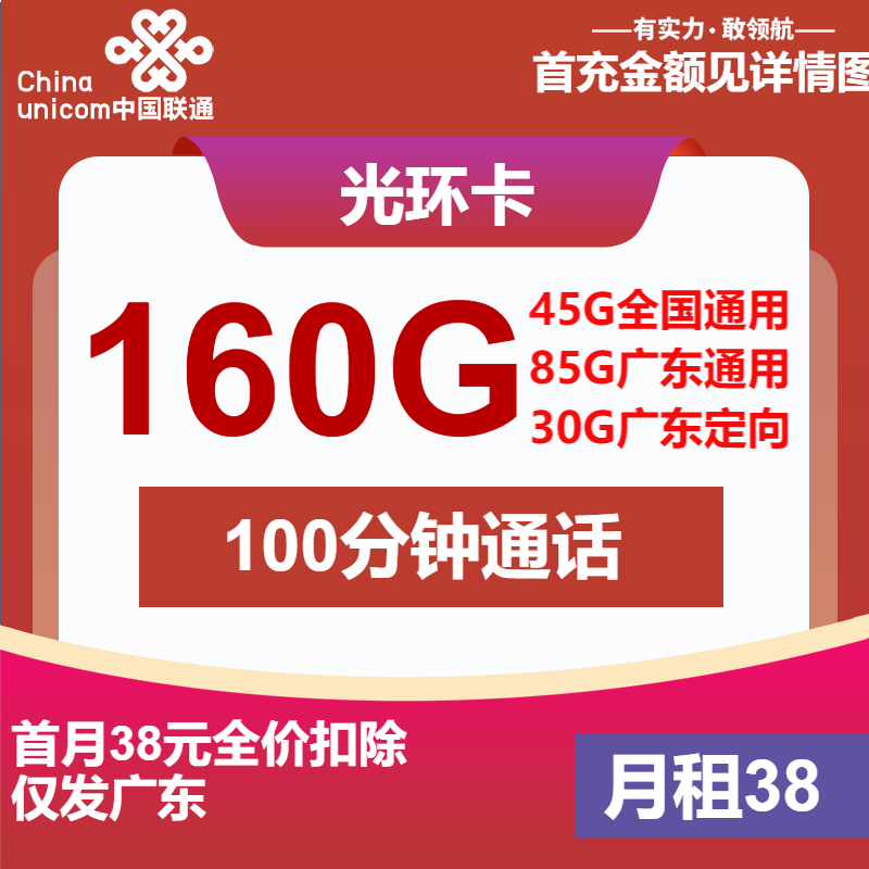 免费办理入口:联通光环卡38元包130G通用+30G定向+100分钟