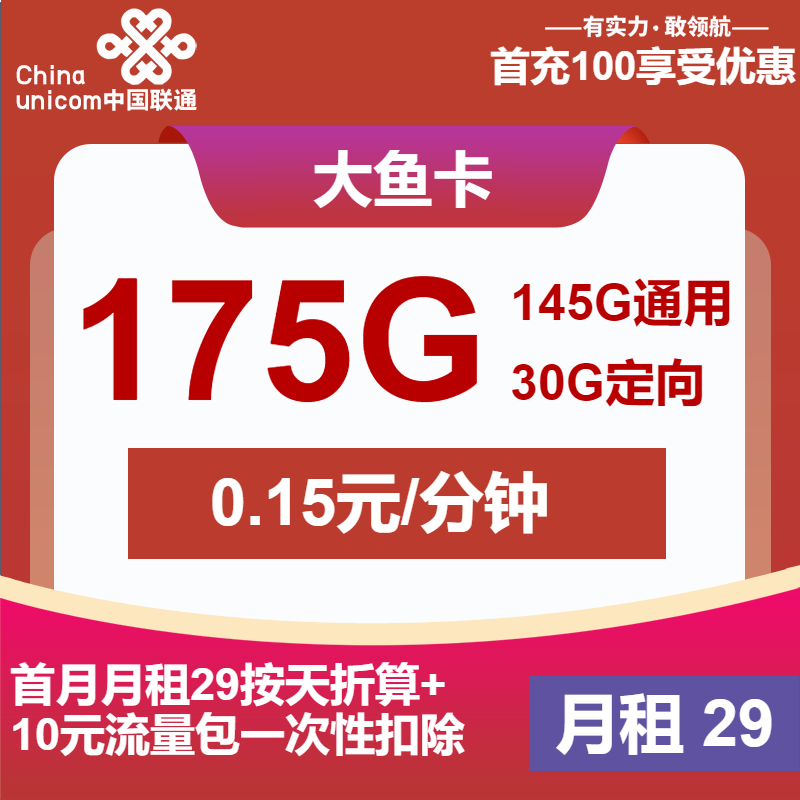 联通大鱼卡29元包145G通用+30G定向+通话0.1元/分钟