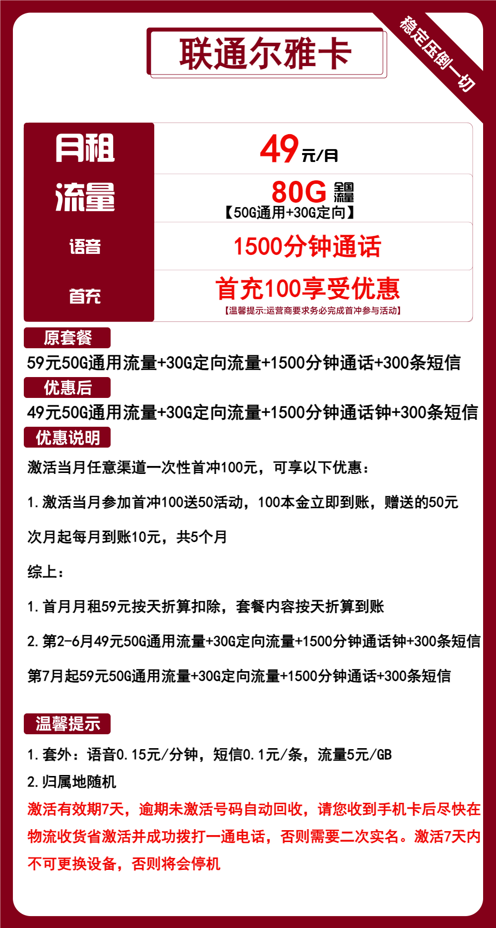 免费办理入口:联通尔雅卡49元包50G通用+30G定向+1500分钟通话
