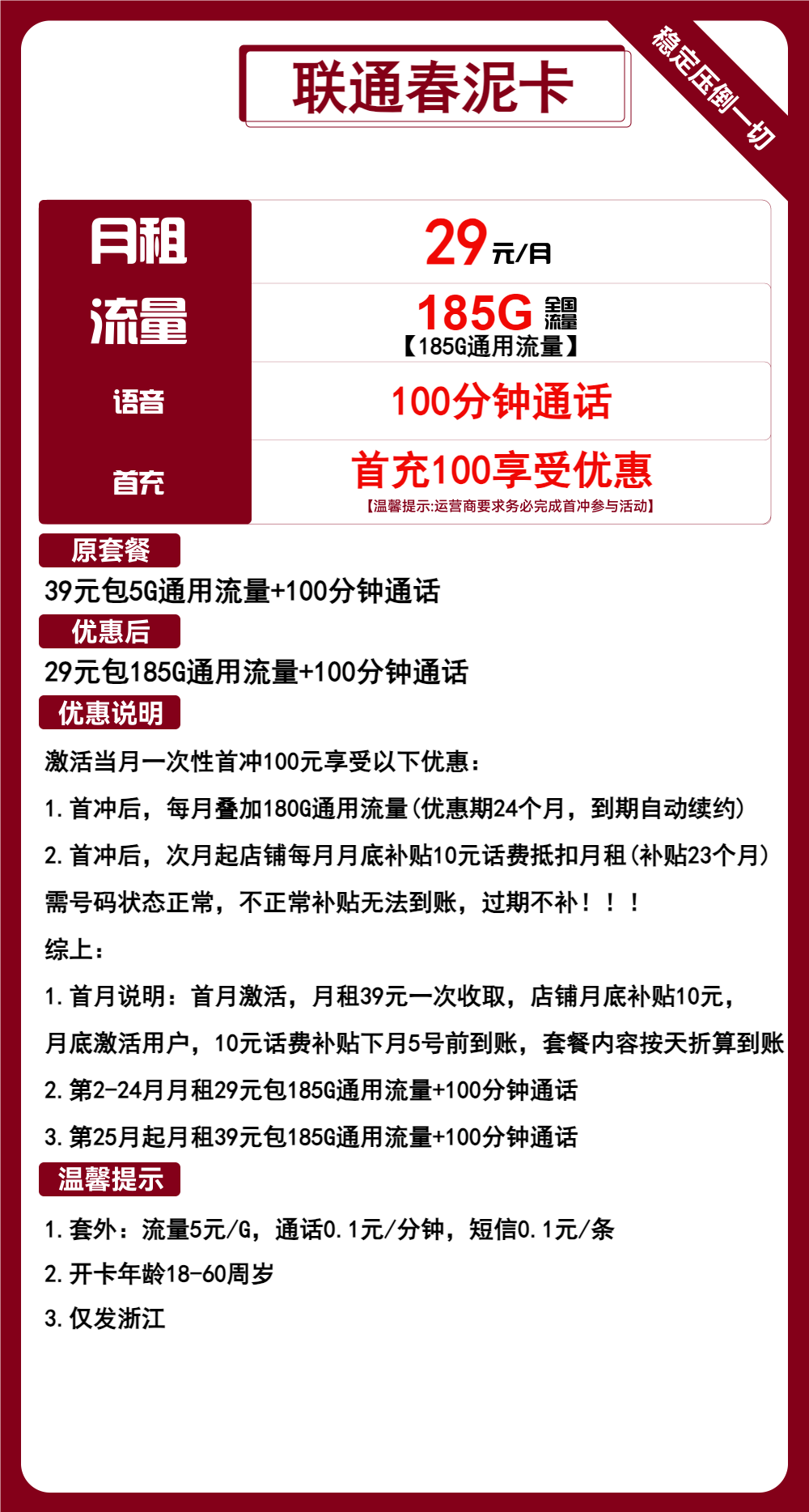 联通春泥卡29元包185G通用+100分钟通话