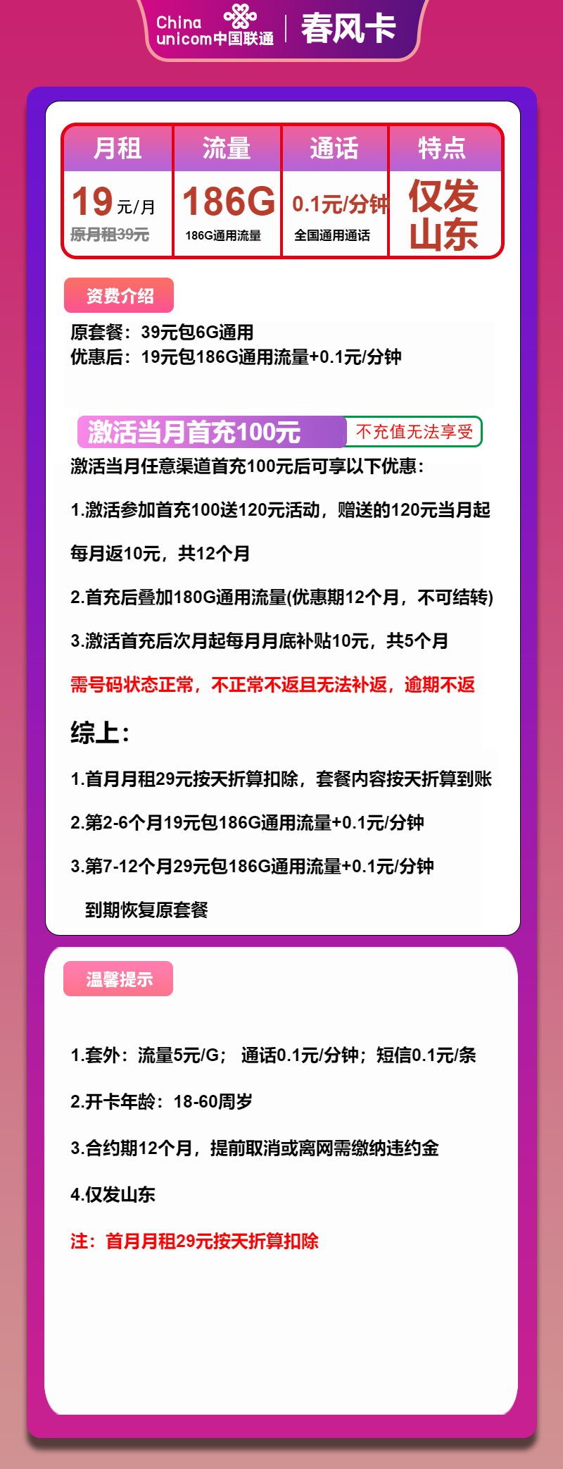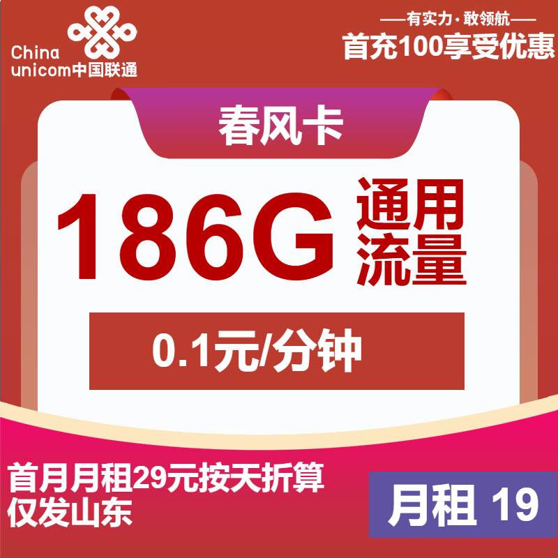 免费办理入口:联通春风卡19元包186G通用+通话0.1元/分钟