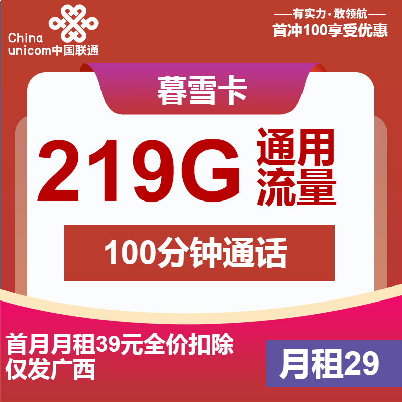 免费办理入口:联通暮雪卡29元包219G通用+100分钟通话