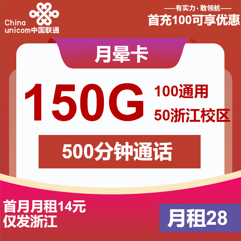联通月晕卡28元包100G通用+50G校区+500分钟+会员