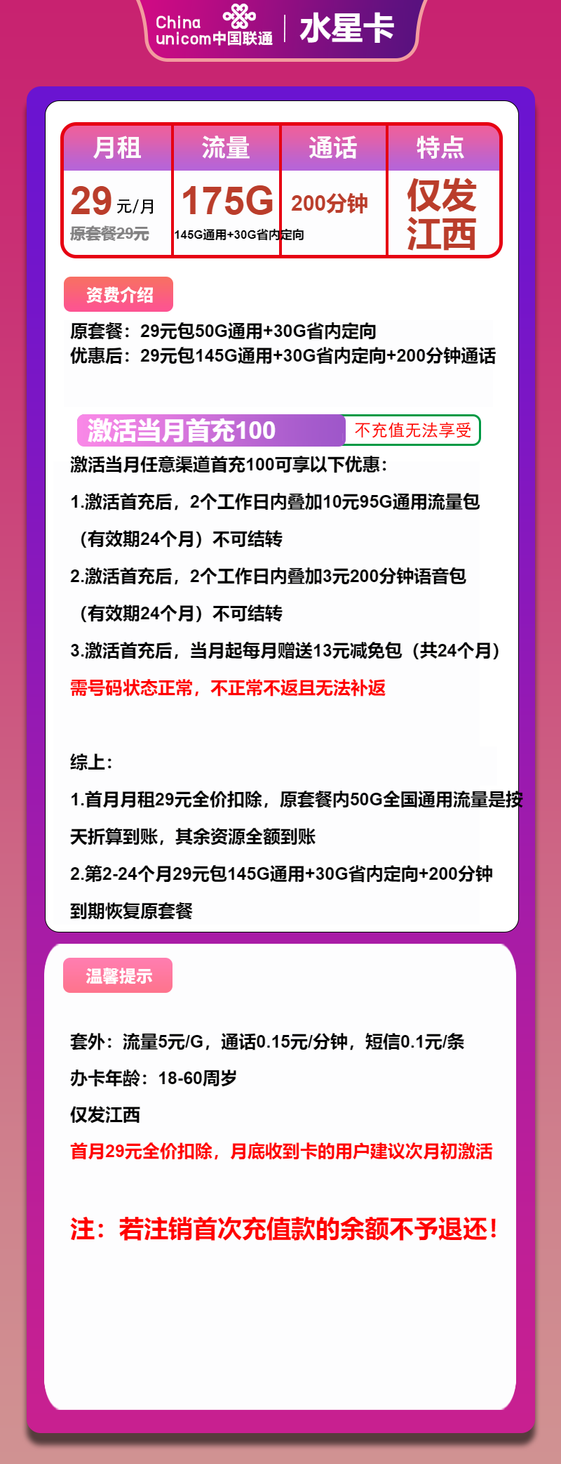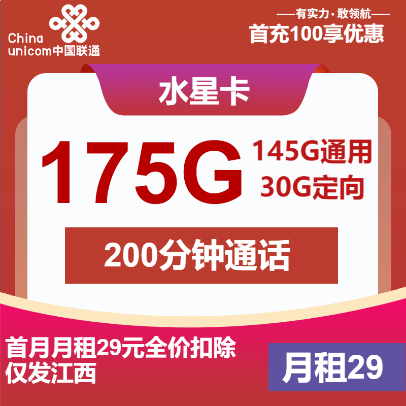 免费办理入口:联通水星卡29元包145G通用+30G定向+200分钟