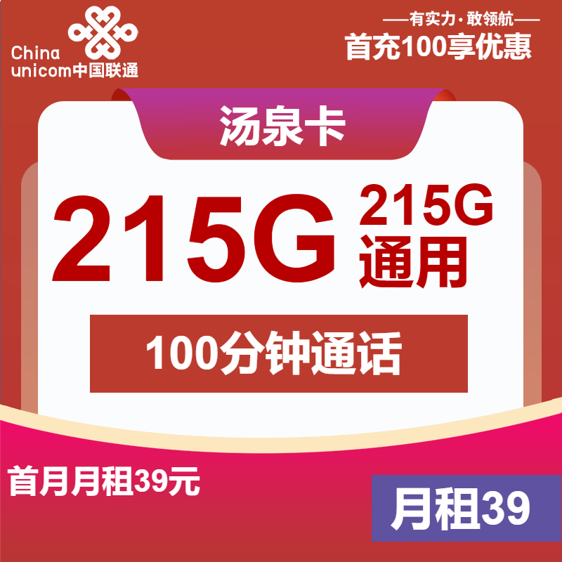 免费办理入口:联通汤泉卡39元包215G通用+100分钟