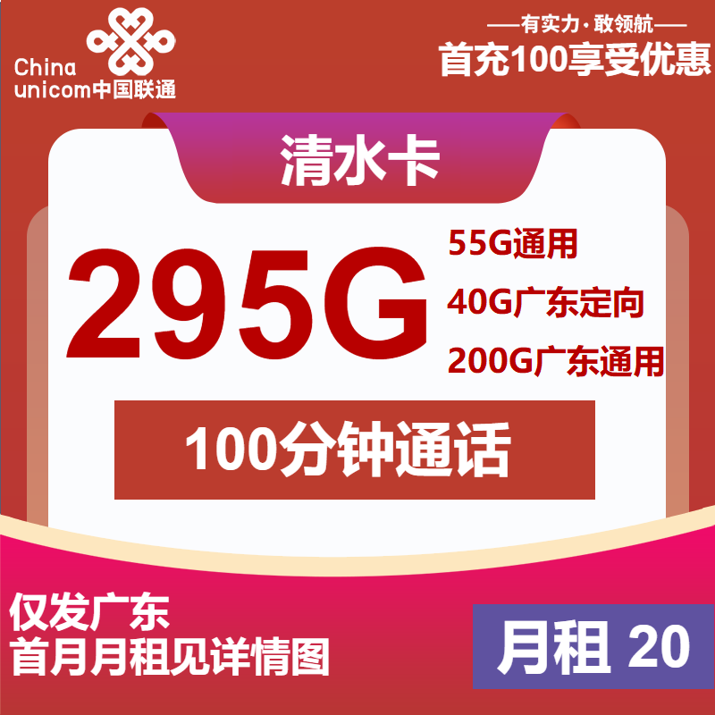联通清水卡20元包55全国通用+200G广东通用+40G广东定向+100分钟通话
