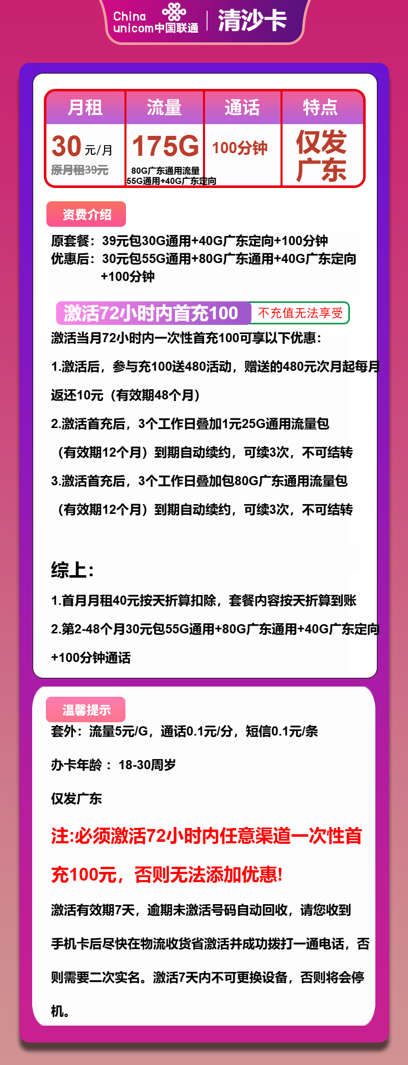 联通清沙卡30元包135G通用+40G定向+100分钟