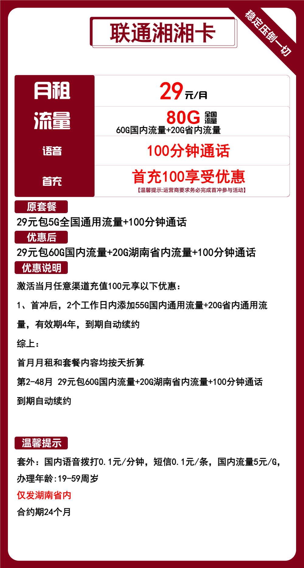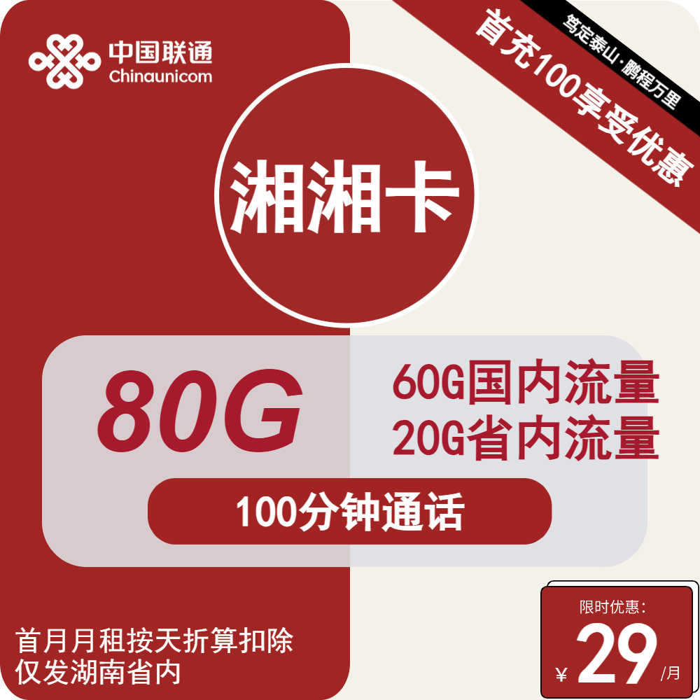 免费办理入口:联通湘湘卡29元包80G通用+100分钟通话