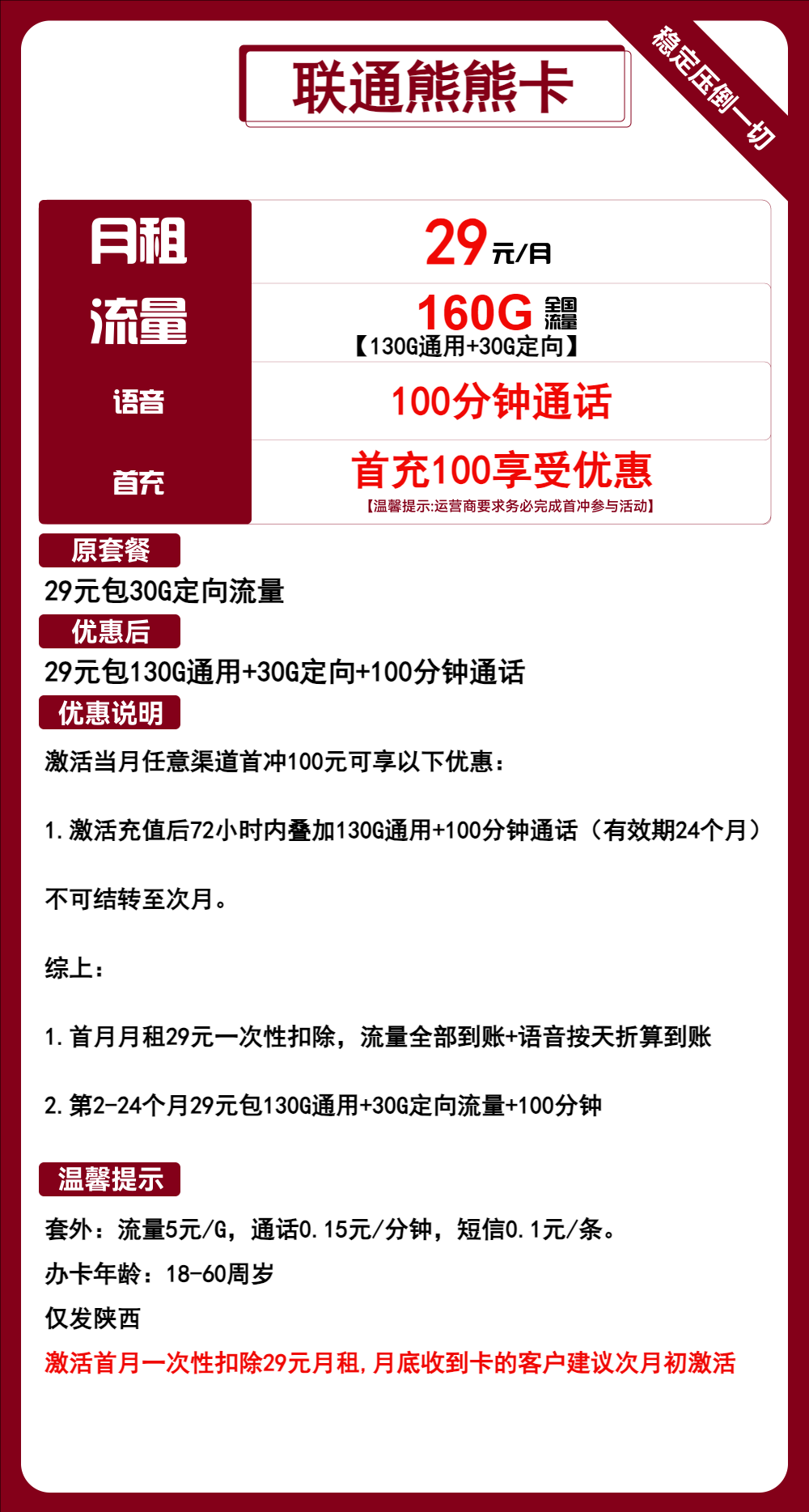 联通熊熊卡29元包130G通用+30G定向+100分钟
