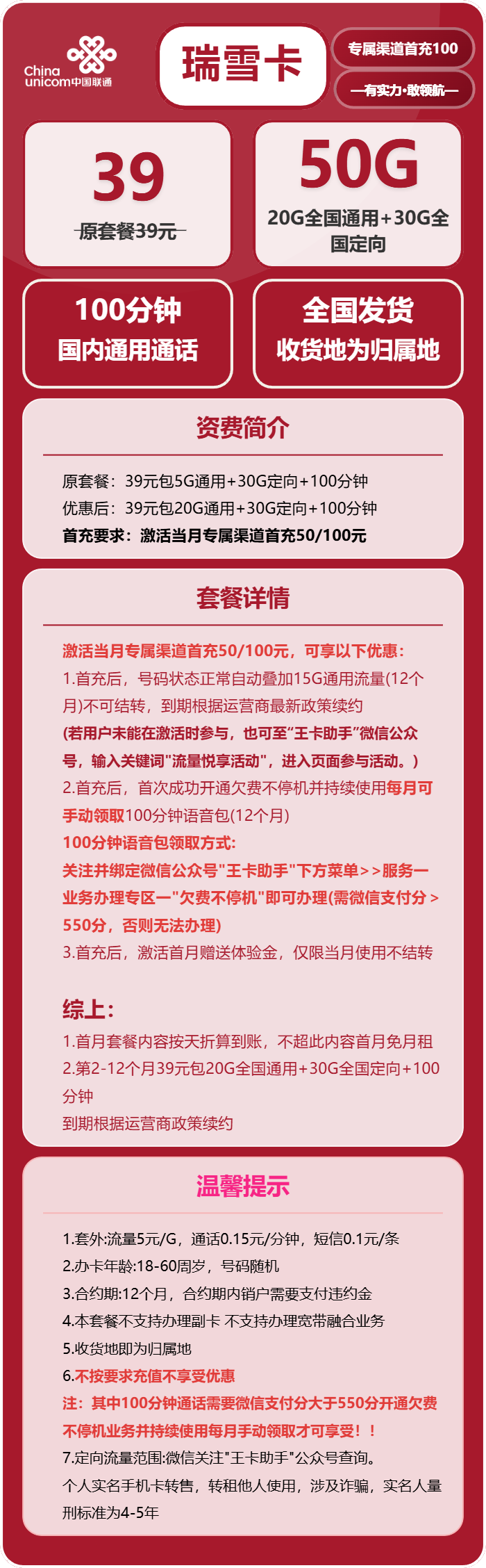- 联通瑞雪卡39元包20G通用+30G定向+100分钟免费领取 包邮到家 2026-01-12