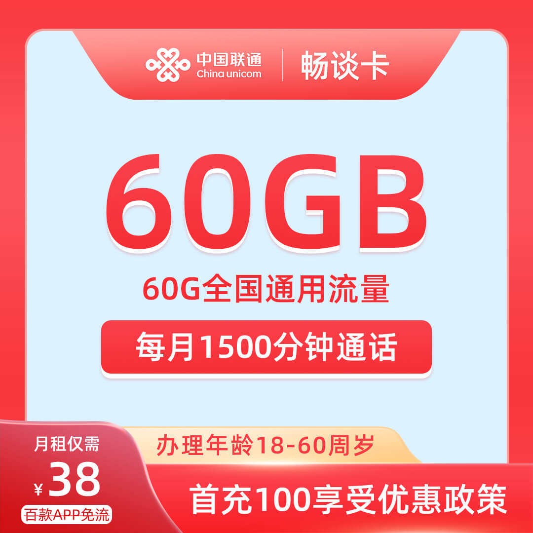 免费办理入口:联通畅谈卡38元包60G通用+1500分钟通话