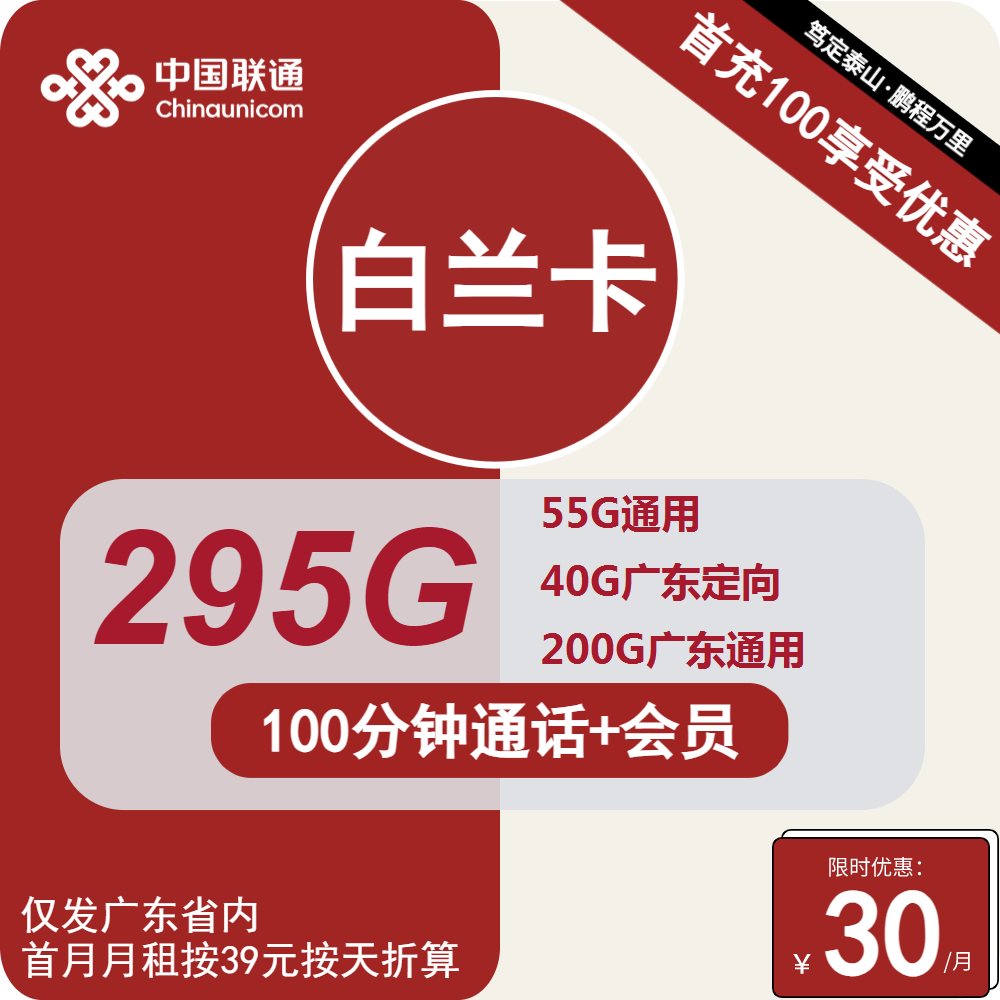 联通白兰卡30元包55G通用+40G广东定向+200G广东通用+100分钟+会员