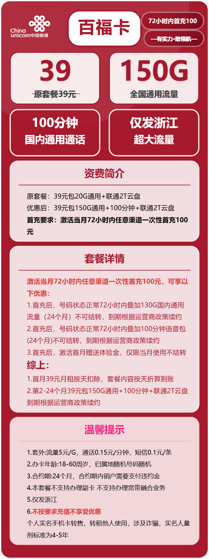 - 联通百福卡39元包150G通用+100分钟通话免费领取 包邮到家 2026-01-13