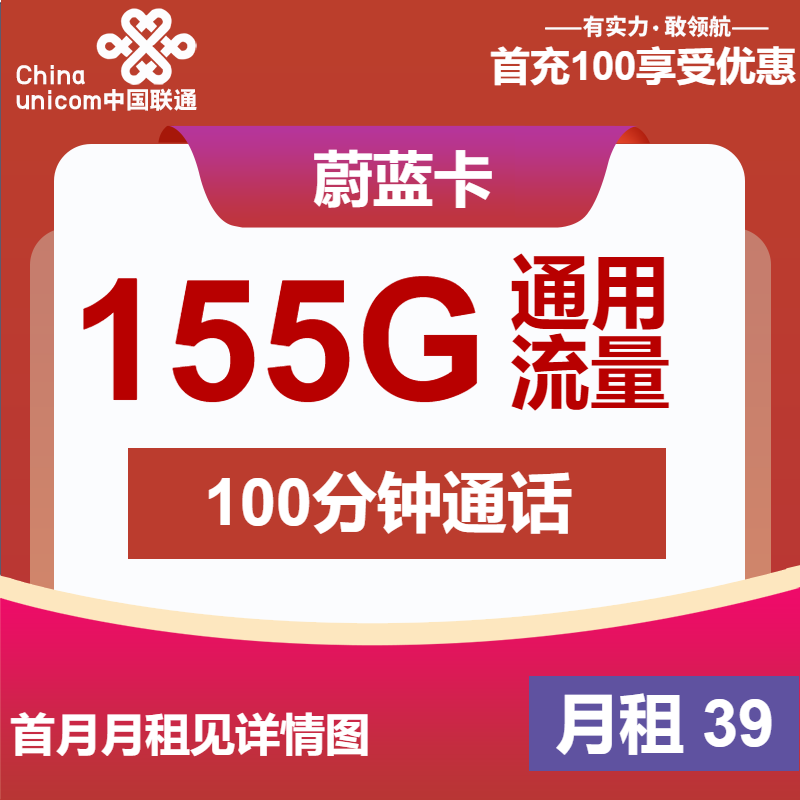 联通蔚蓝卡39元包155G通用+100分钟通话