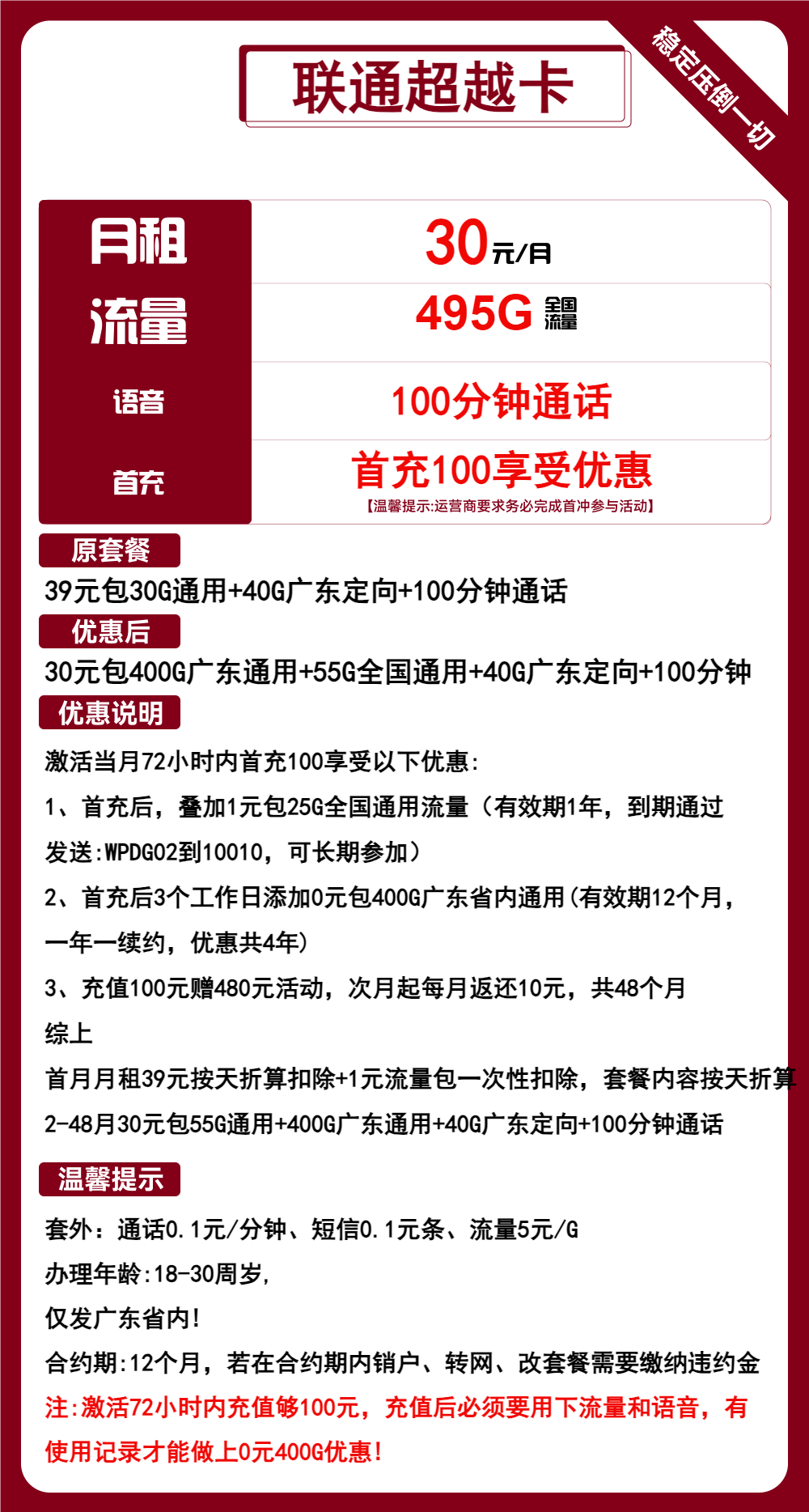 免费办理入口:联通超越卡30元包400G广东通用+55G全国通用+40G定向+100分钟