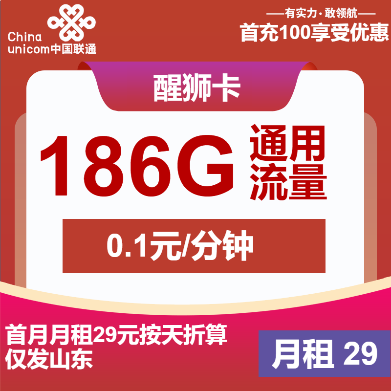 免费办理入口:联通醒狮卡29元包186G通用+通话0.1元/分钟