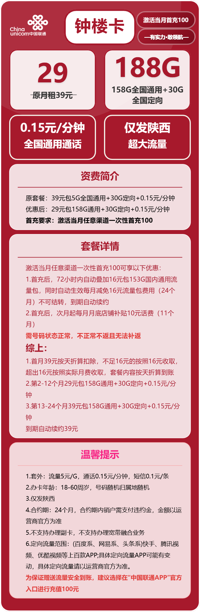 联通钟楼卡29元包158G通用+30G定向+通话0.15元/分钟免费领取 包邮到家