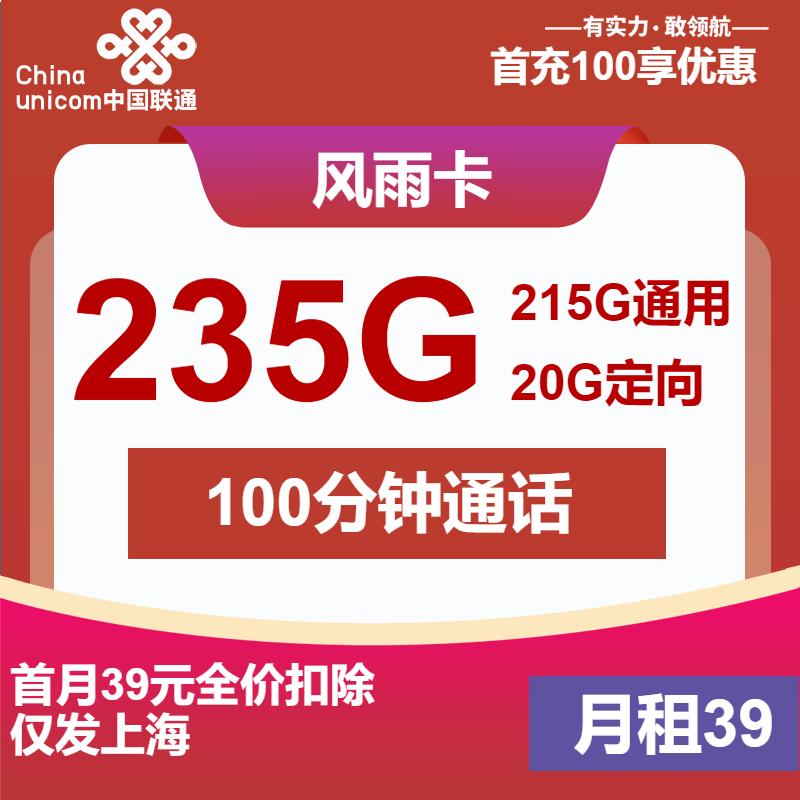 联通风雨卡39元包215G通用+20G定向+100分钟