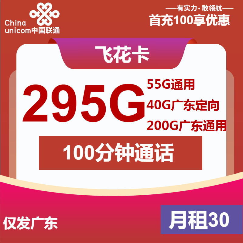 联通飞花卡30元包55G通用+40G广东定向+200G广东通用+100分钟
