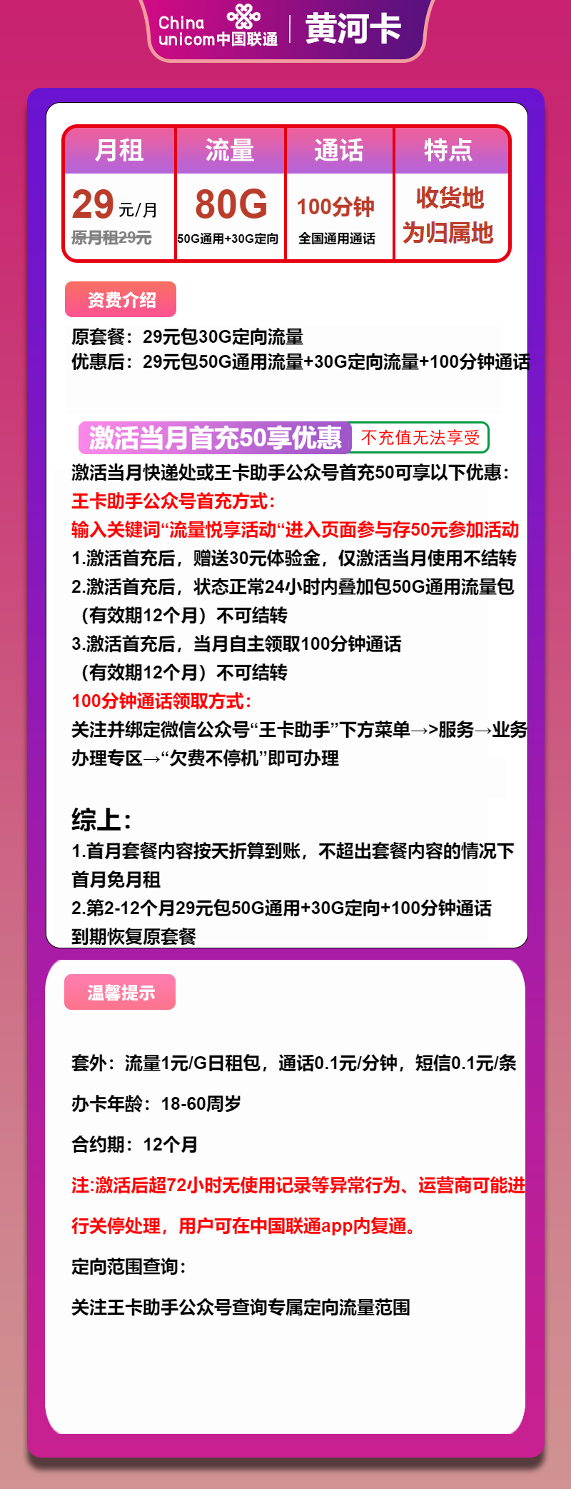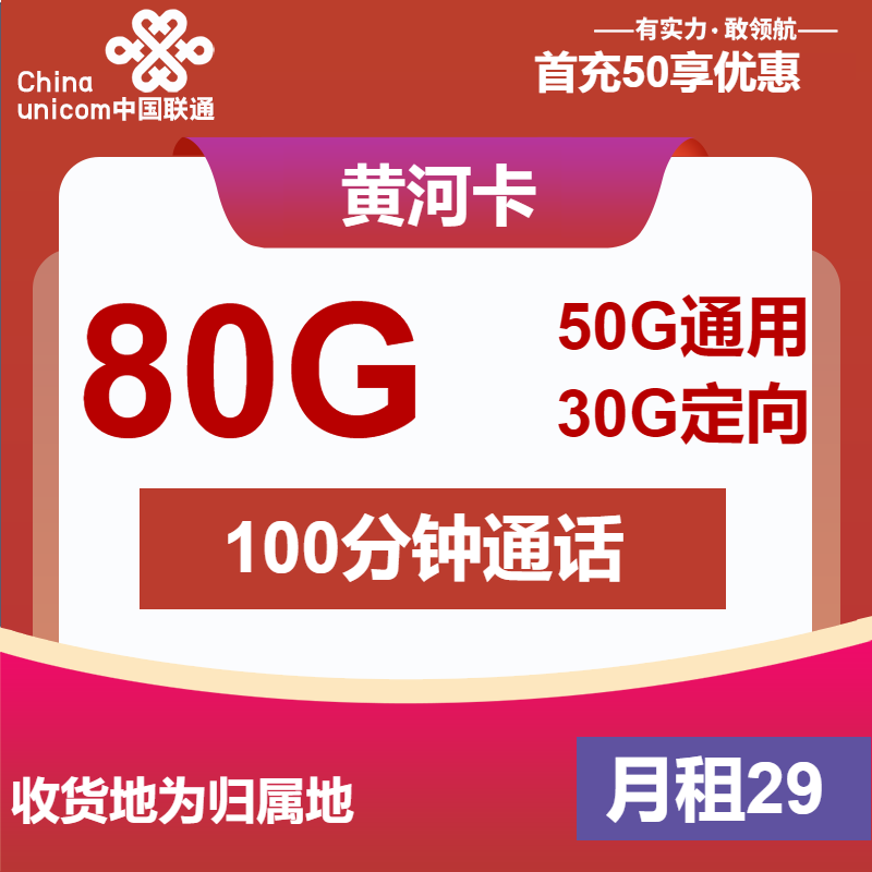 联通黄河卡29元包50G通用+30G定向+100分钟通话