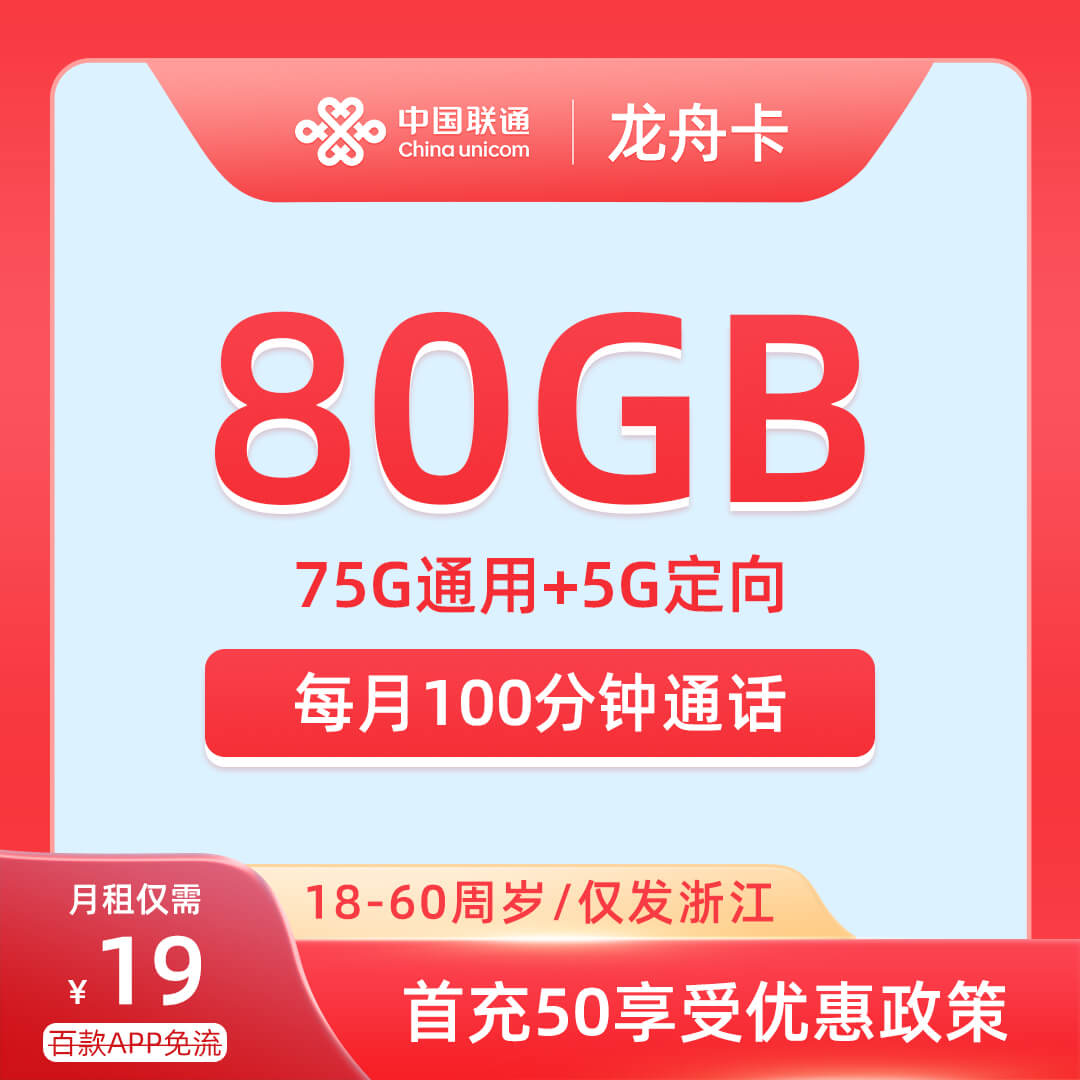 联通龙舟卡19元包75G通用+5G定向+100分钟通话