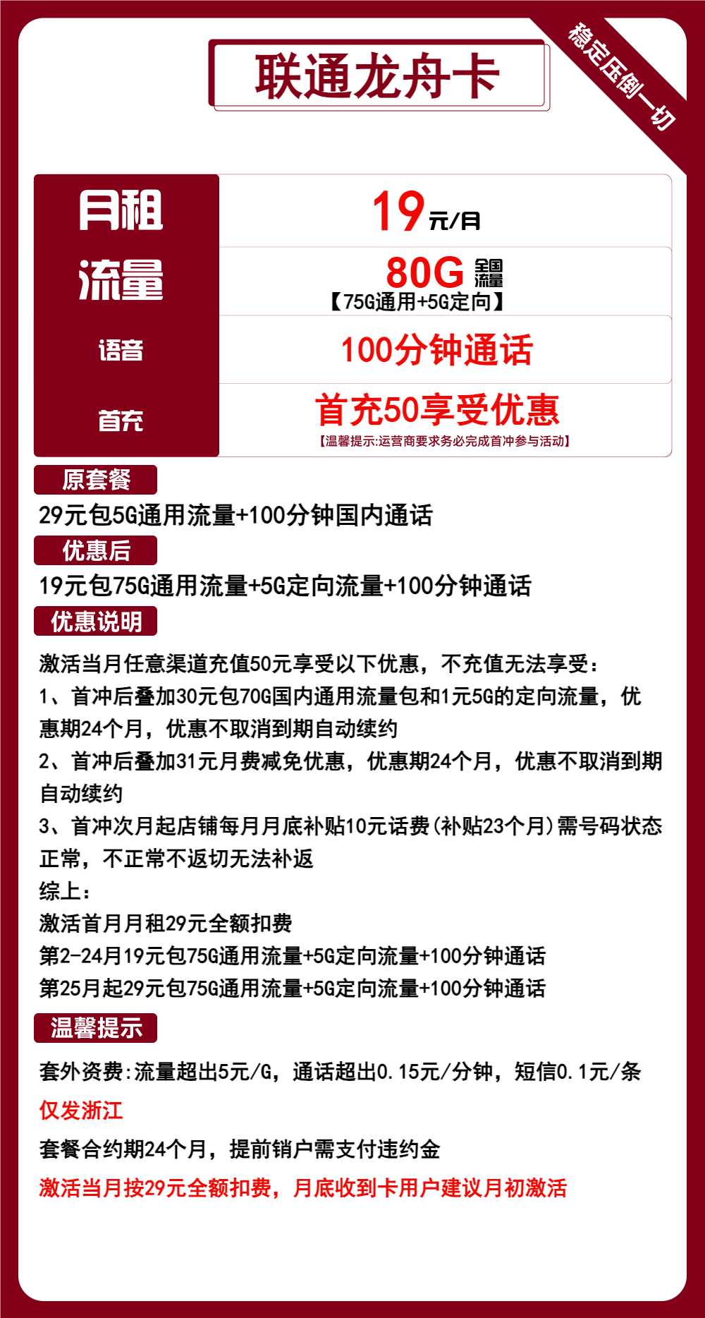 免费办理入口:联通龙舟卡19元包75G通用+5G定向+100分钟通话