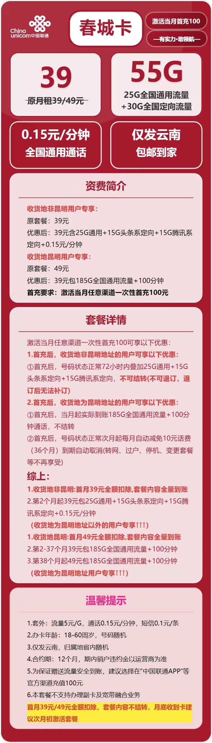 联通春城卡39元包25G通用+30G定向+通话0.15元/分钟admin6天前发布4.2W+768 年龄限制:18-60周岁 套餐合约:12个月 配送方式:京东/联通 激活方式:快递员上门激活 首充渠道:激活当月任意渠道一次性首充100元 免费领取 包邮到家 © 版权声明分享是一种美德,转载请保留原链接THE END联通流量卡 点赞是一种美德点赞768